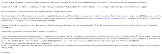 August 23 2021, Dairy NZ CEO Tim Mackle is formally made aware of market concerns as to resource allocation managing the Class Exemption and its delays to this point.
