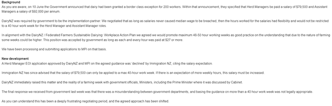 It has been suggested (we await the Official Information Act request to verify this) that Dairy NZ CEO Tim Mackle has written to departmental colleagues in recent weeks and asked “for working hours under the exemption to be variable” and for the “40 hour working cap to be removed”.