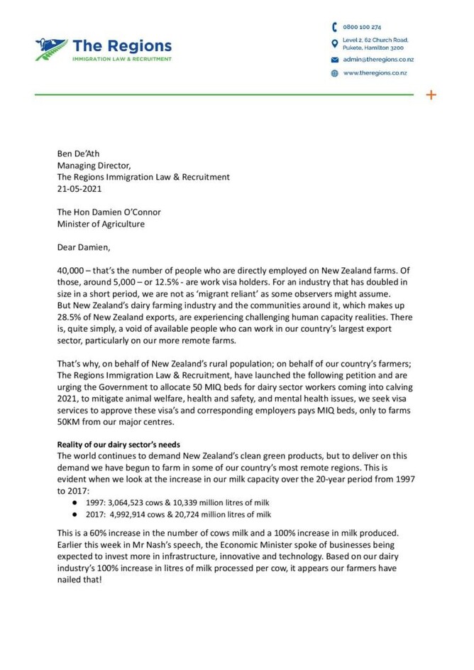 Dairy Industry MIQ Bed petition, seeks 50 beds for dairy farms 50km from the major centres, prior to calving 2021.